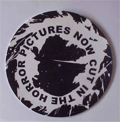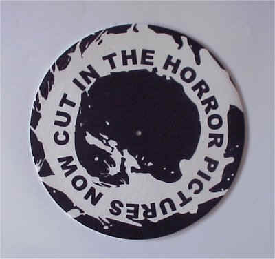 Kendell Geers' edition "The Electronic Revolution" is a black & white slipmat with the text "Now Cut In The Horror Pictures", available in 4 different designs, each an edition of 25, signed and numbered, 2004.