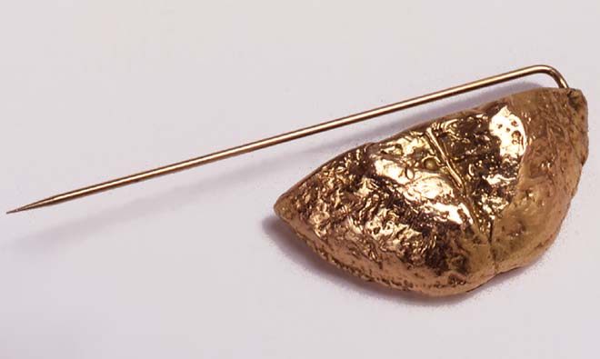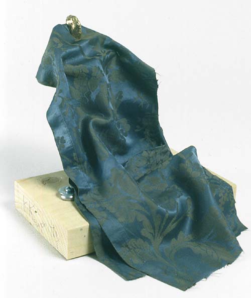 Notice: Kiki Smith's contribution to Bouquet is an 18 karat gold pin cast from the tip of her tongue, and perched on the crest of the silk wave created by Tuttle's armature. This body piece is a delicate bridge between Smith's earlier body works and her recent work with decorative motifs and precious materials. Richard Tuttle has created a sculpture that acts as a display for the pin as well as the swath of damask, a 19th Century reproduction of a 16th Century silk cloth. The simple armature is constructed from raw wood, wire and hardware; materials the artist has worked with to great effect for decades. The pin is meant to be worn, essentially an example of two elements that exist separately but that are always meant to come together to be complete.
