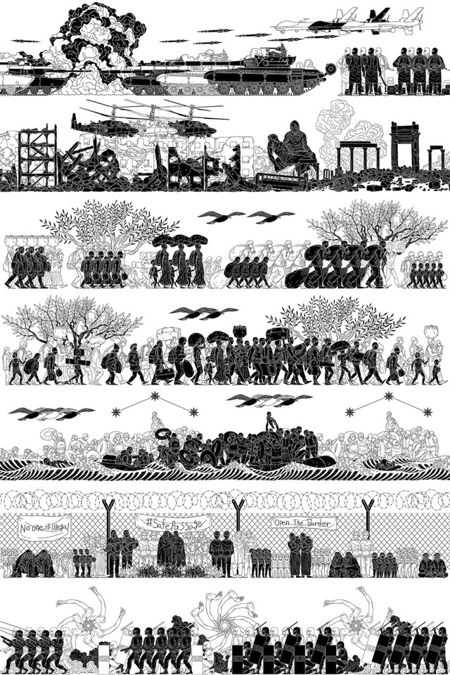 In a compelling and beautiful new print, Ai Weiwei calls attention to our shared humanity by adapting the style of classical Greek friezes and vase paintings to depict the many forms of the contemporary global refugee condition. This brand new print is being unveiled on the occasion of Ai’s ambitious citywide Public Art Fund exhibition Good Fences Make Good Neighbors, on view in New York City Oct 2017 – Feb 2018. The bold and striking imagery in Odyssey is based on a work of the same title featured in the exhibition.